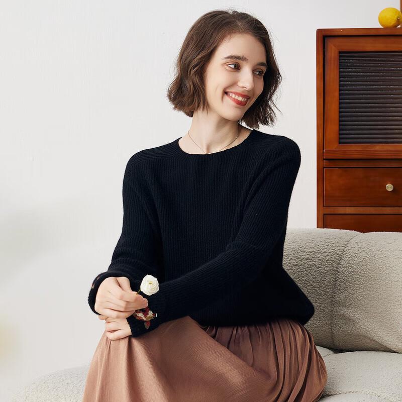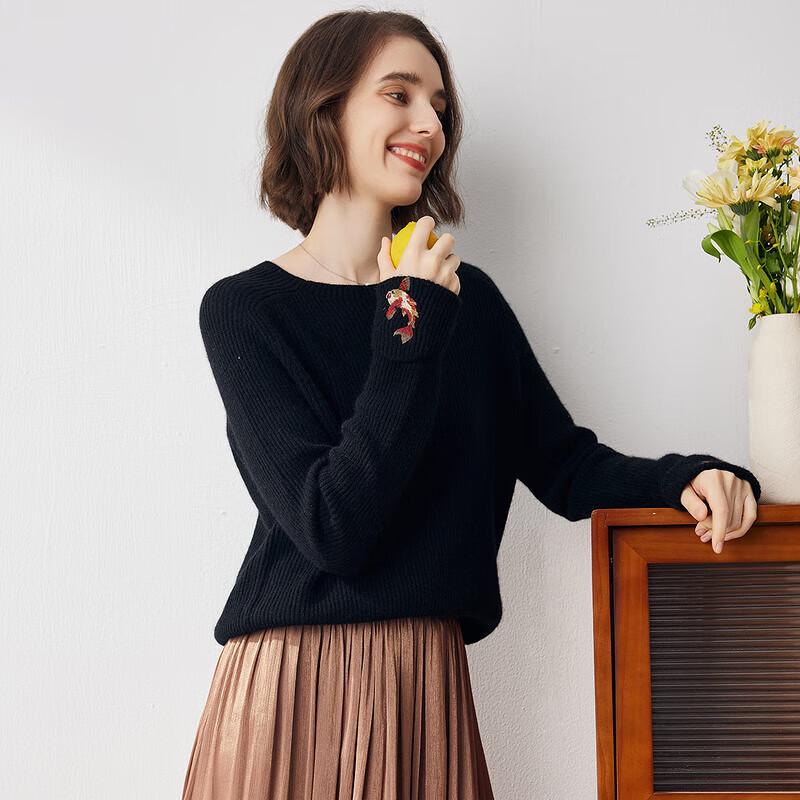 Komonboka Women's Pure Cashmere Embroidered Round Neck Sweater