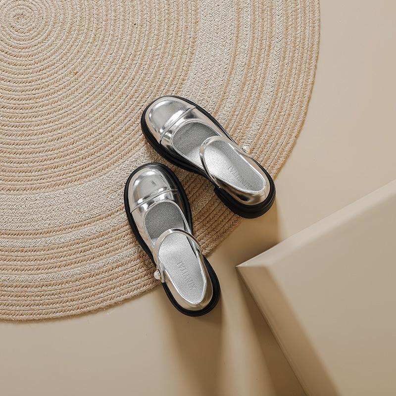 Серебристые туфли Мэри Джейн женские жемчужные на толстой подошве с открытым вырезом одинарные туфли женские в стиле маленького ароматного ветра с круглым носком на толстом каблуке туфли jk