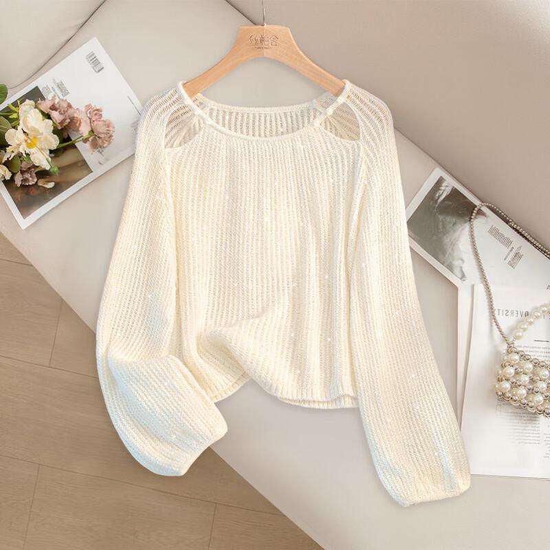 Женский свитер свободного кроя с круглым вырезом и отделкой пайетками