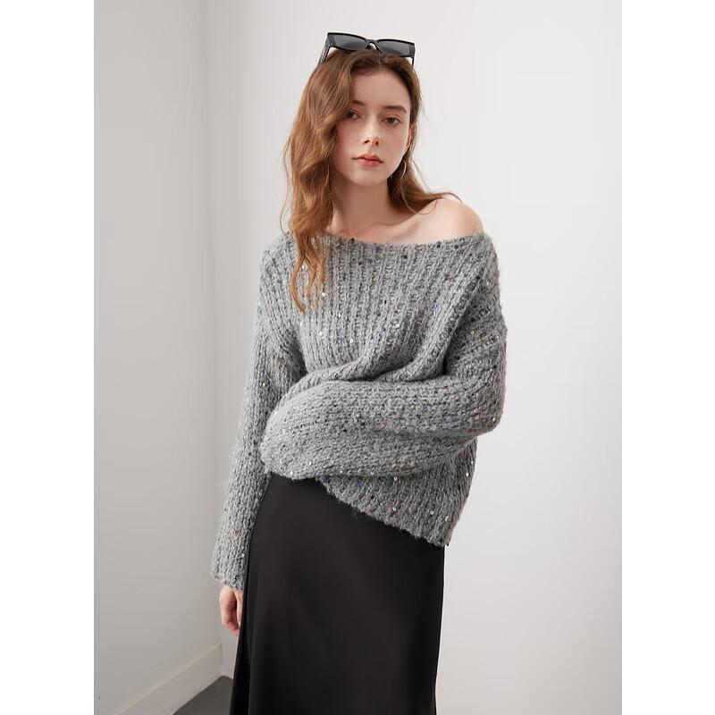 Sancai 2024 Зимний трикотажный кроп-пуловер с пайетками и открытыми плечами
