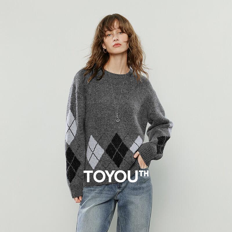 Chuyu Women's Diamond Pattern Round Neck Sweater — купить товар онлайн с бесплатной доставкой до всему миру!