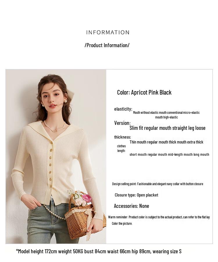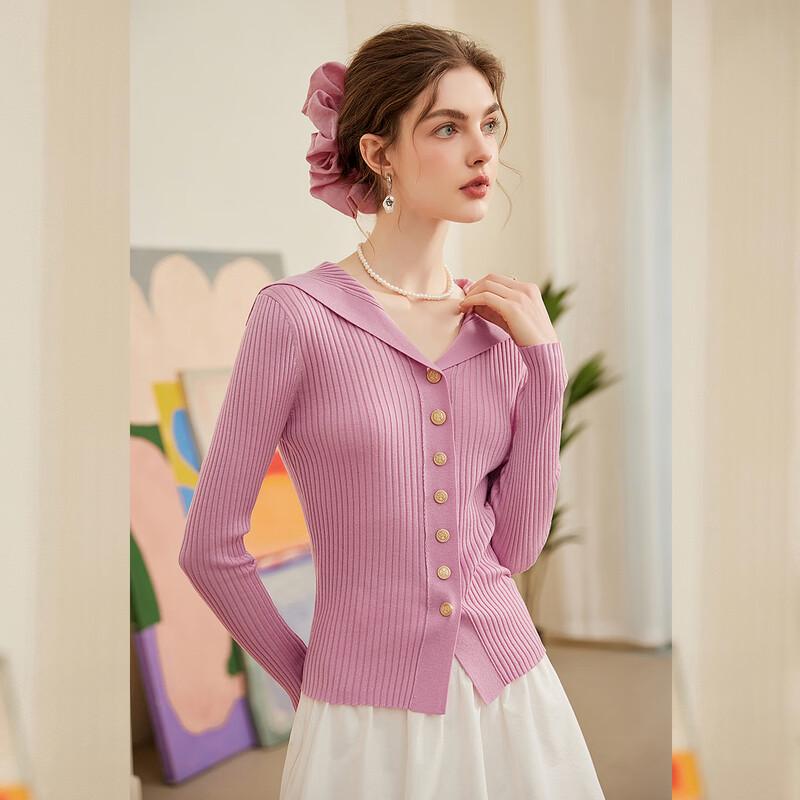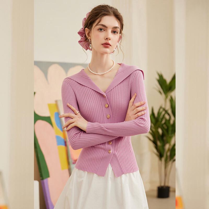 Элегантный женский вязаный кардиган Bailuyu приталенного силуэта с темно-синим воротником