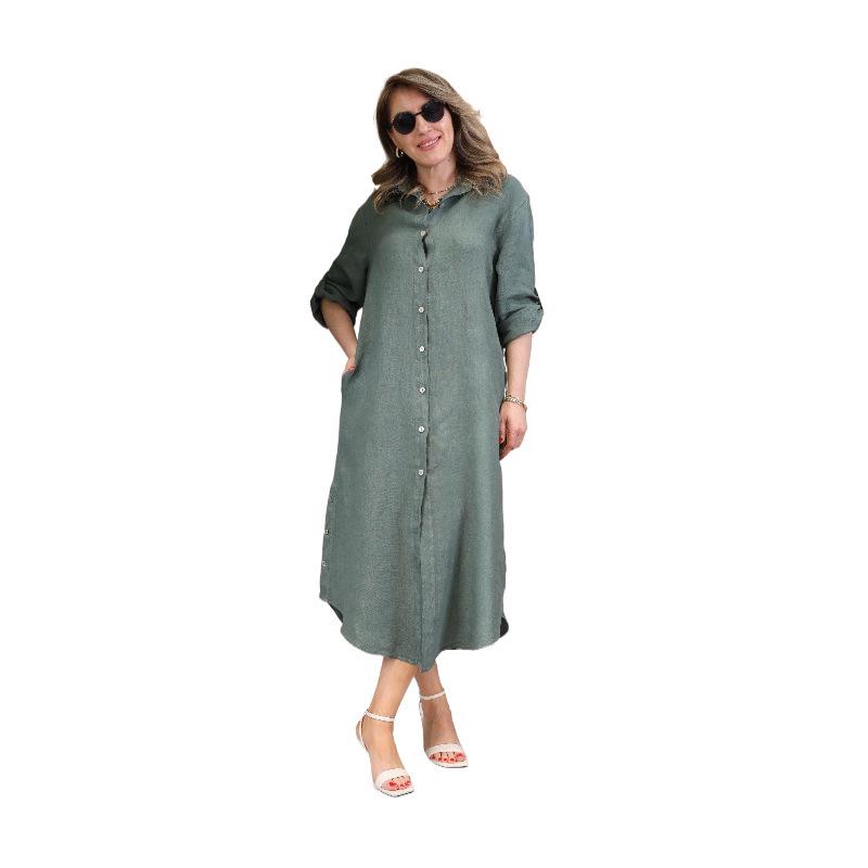 Оцените идеальное сочетание комфорта и стиля с этим платьем-рубашкой большого размера на пуговицах, изготовленным из премиального льна для дышащего и легкого ощущения.. Платье, выполненное в европейском и американском повседневном стилях, украшено элегантным кружевным вырезом, который добавляет нотку изысканности.. Идеальное для любого повседневного случая, это платье предлагает лестный крой и вневременную привлекательность.