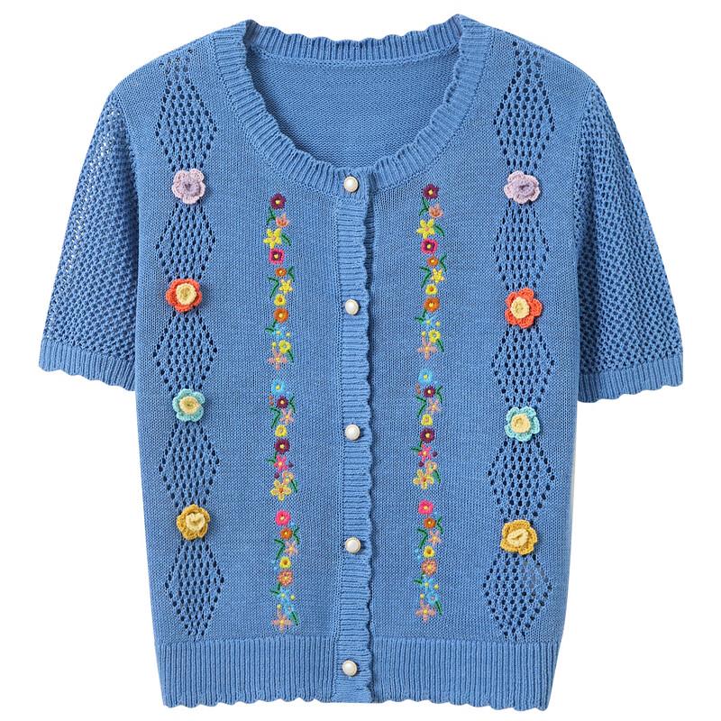 Sancai Women's 2025 Summer Hollow Floral Knit Short Sleeve Cardigan