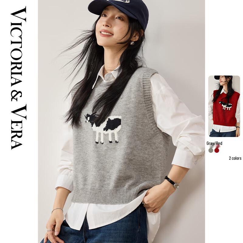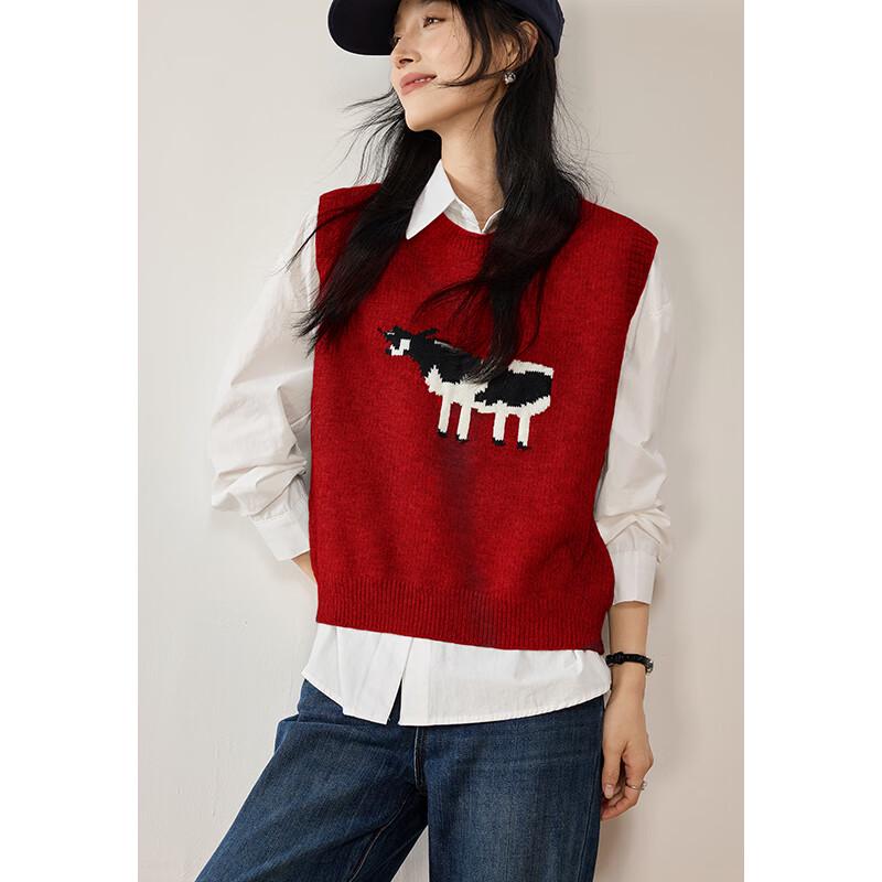 VICTORIA&VERA Women's Cartoon Cow Jacquard Sleeveless Vest