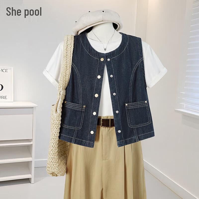 Женский джинсовый жилет в академическом стиле с круглым вырезом