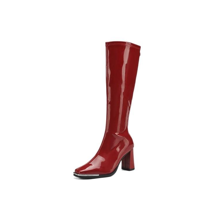Но женские ботфорты на высоком каблуке 2025 лето новые универсальные с квадратным носком на толстом высоком каблуке лакированная кожа универсальные сапоги