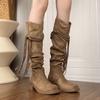 Версия из коровьей кожи~ ретро пустошь бахрома рыцарские сапоги толстый каблук, но ботфорты до колена тонкий ворс полусапожки женские