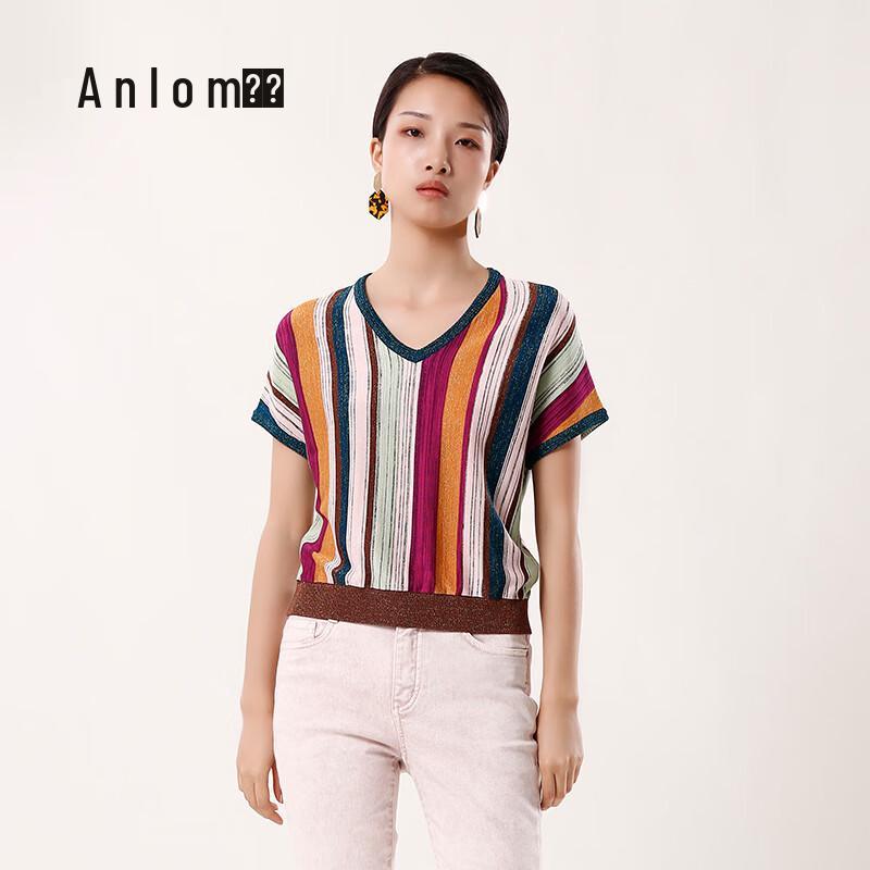 Женский полосатый трикотажный топ с V-образным вырезом и короткими рукавами