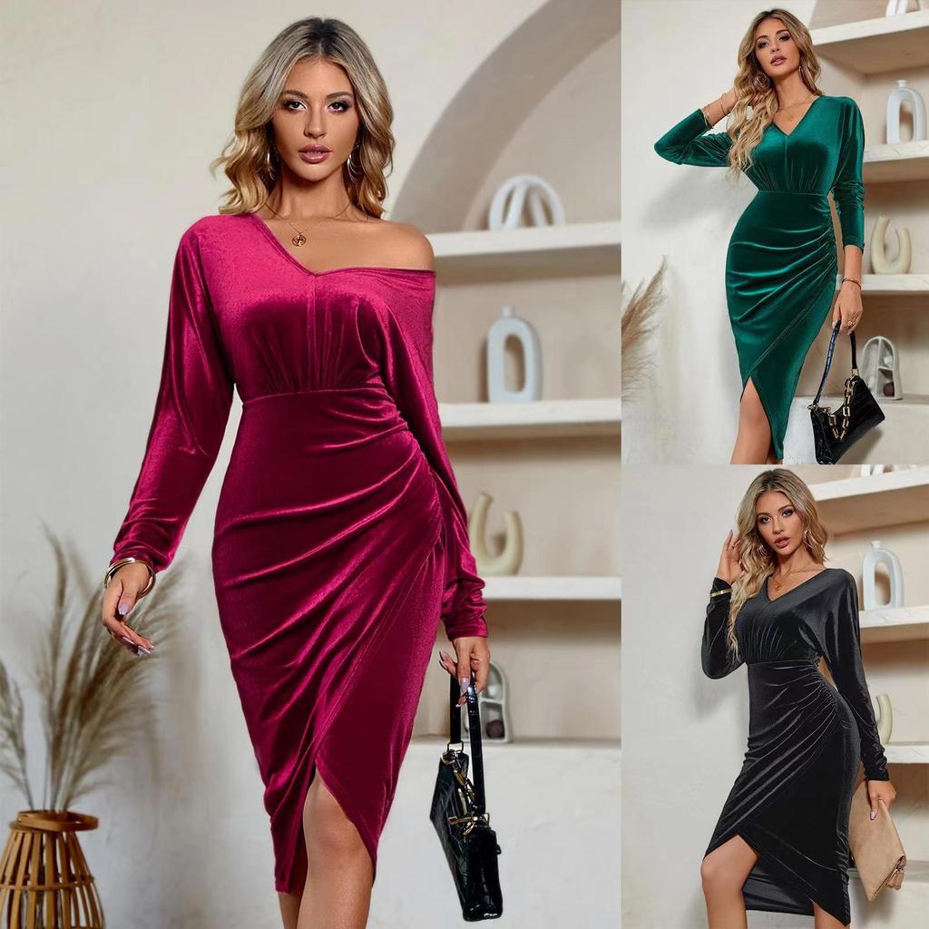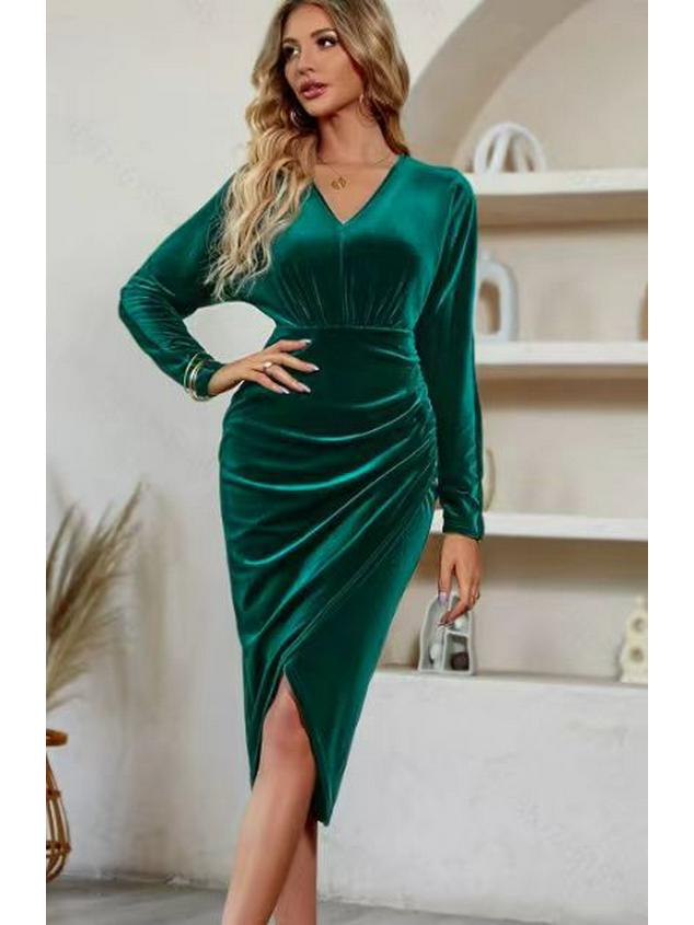 2023 Женское зимнее повседневное платье с V-образным вырезом, однотонное, приталенное