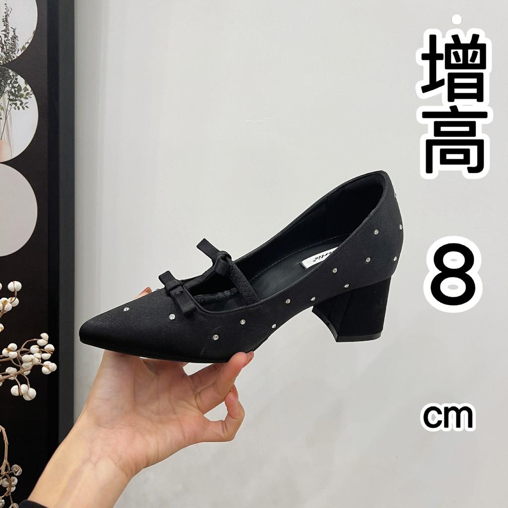 Inner heightening women's shoes satin bow thick heel single shoes 2025 spring new high-end rhinestone pointed high heels