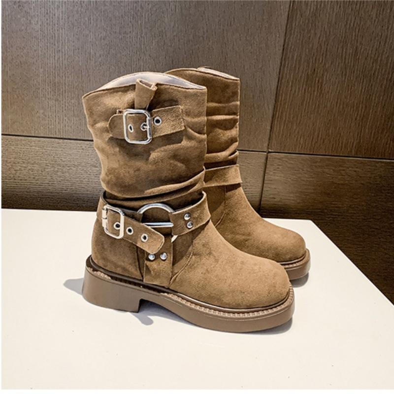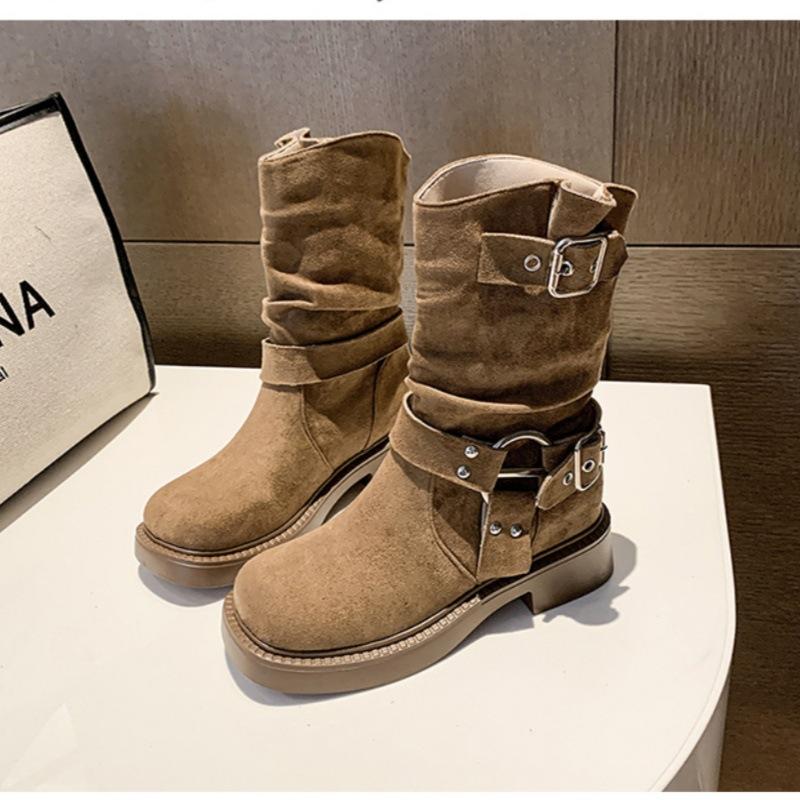 Ботинки на толстой подошве, женские, рыцарские, ретро, замшевые, на толстом каблуке, с круглым носком, новые, 2025 года, тонкие ботинки, в британском стиле, высокие ботинки