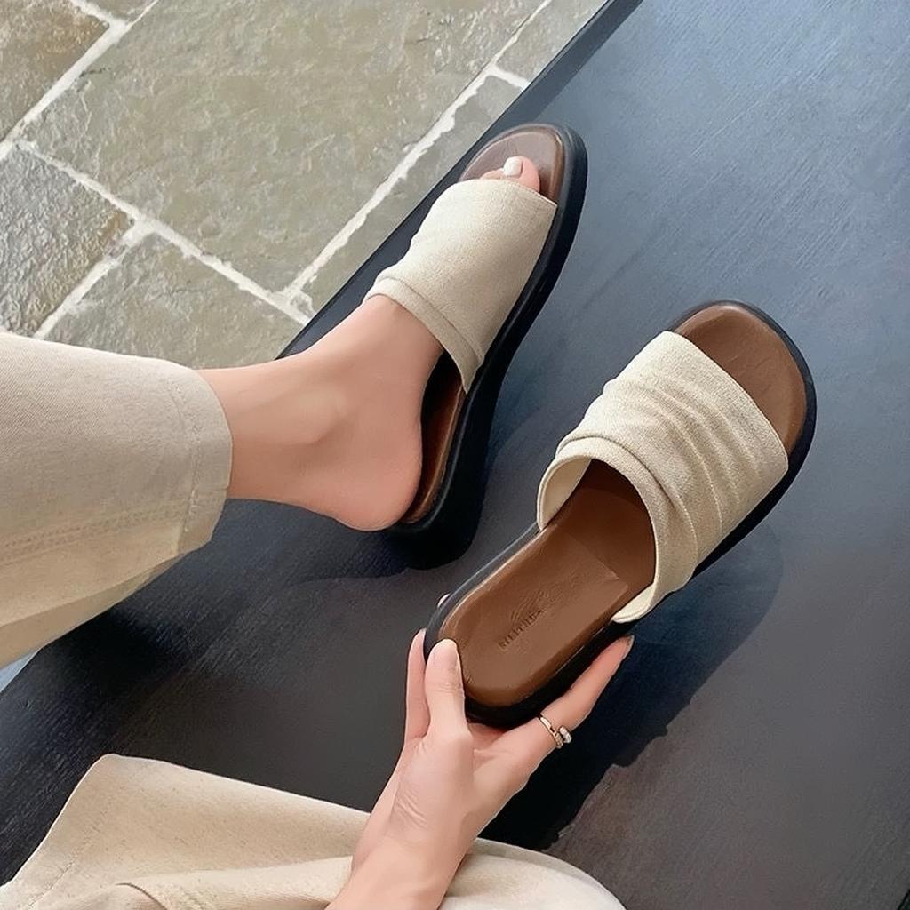 Версия из овчины~ льняные плиссированные шлепанцы на толстой подошве, женские летние, для отпуска, пляжной носки, повседневные крутые шлепанцы