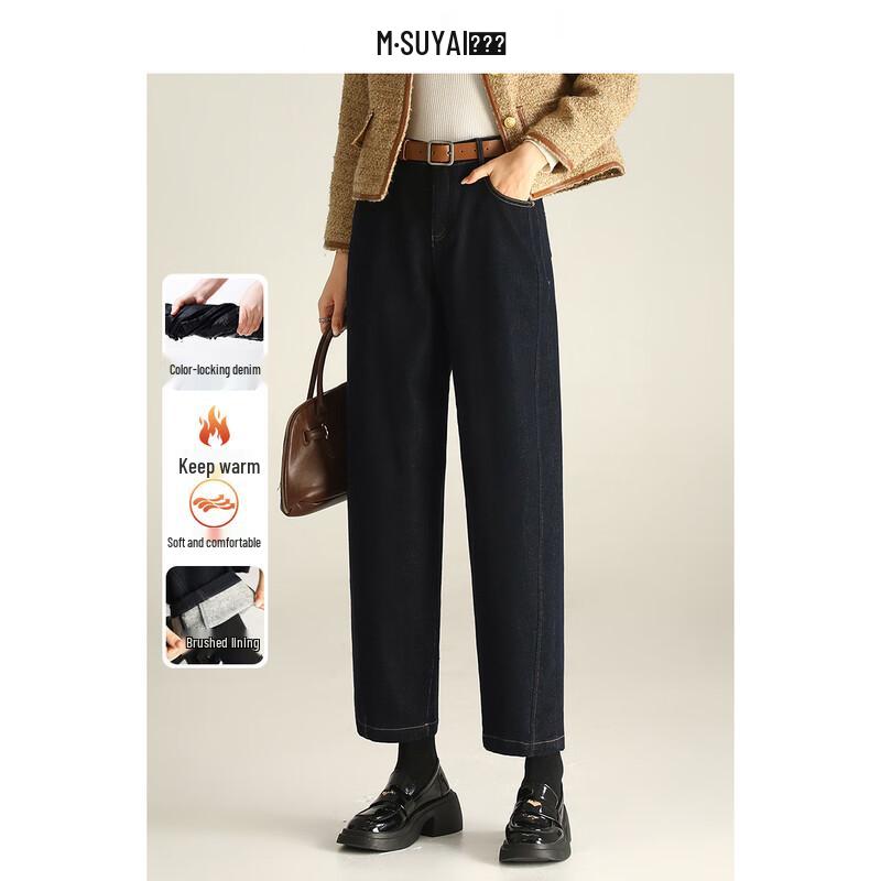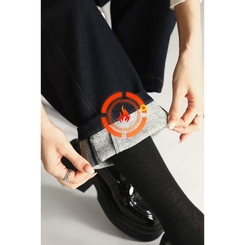 Mengshuya Women's Petite High-Waist Dark Blue Fleece-Lined Dad Jeans