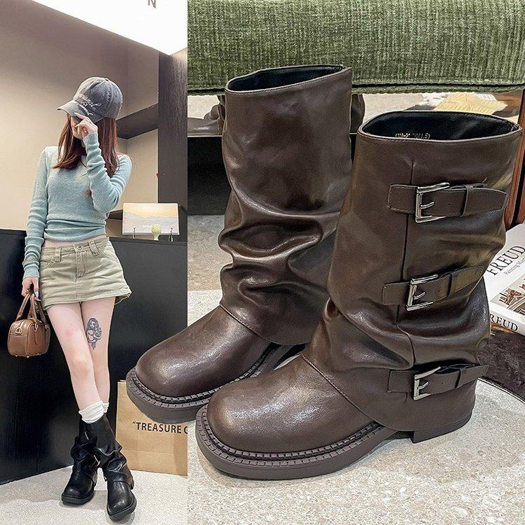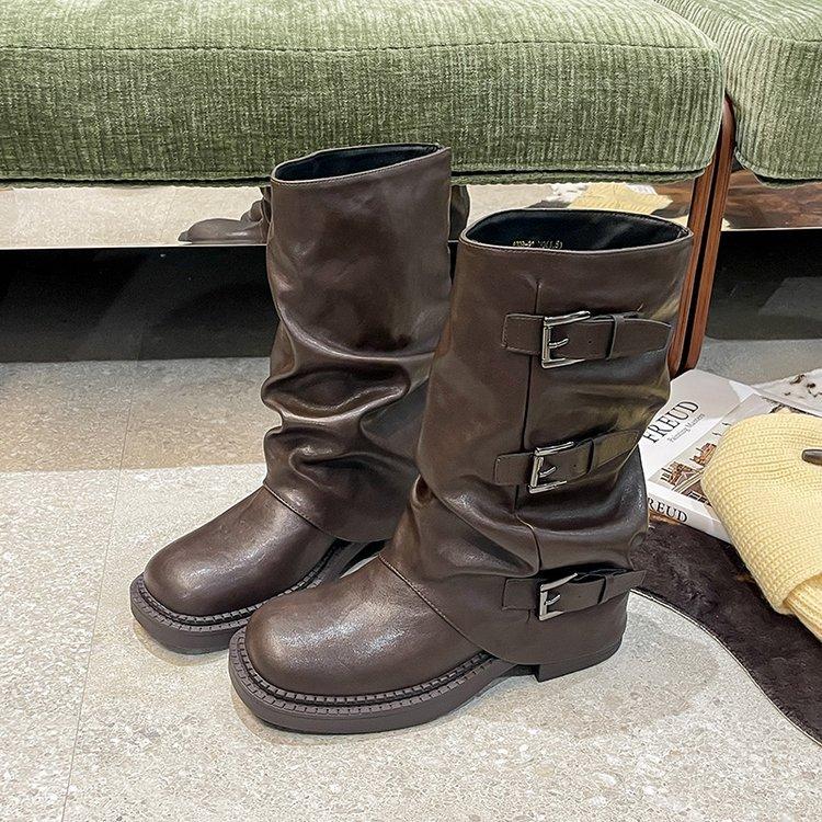 Для сравнения~ Кожаные толстоподошвенные сапоги-вестерны с пряжкой, женские сапоги для уборки, сапоги со сборками, сапоги средней длины с голенищем, сапоги-трубы для брюк