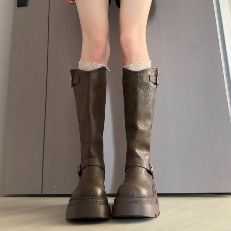Пряжка на ремне рыцарские ботинки маффин низкие высокие женские ботинки трендовый высокий каблук, но до колена голенище 2025 осень и зима новые толстая подошва
