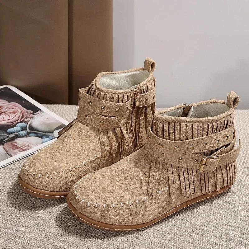 Женские зимние ботинки большого размера с заклепками, женские ретро этнические ботинки в западном стиле, ковбойские ботинки на блочном плоском каблуке с кисточками и бахромой до щиколотки