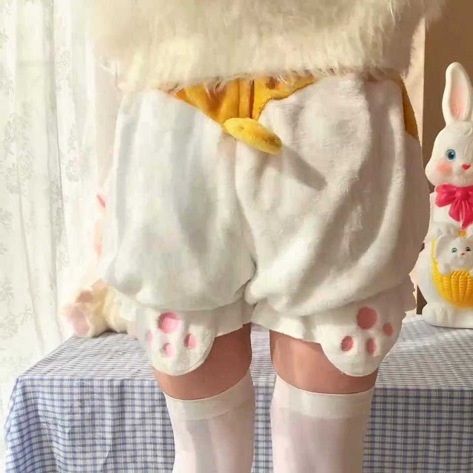 Японский стиль Лолита Осень Зима Женские Милые Шорты с Завышенной Талией Белые Шорты-Фонарики Контрастного Цвета Теплые Памперсы с Хвостиком Костюм для Косплея