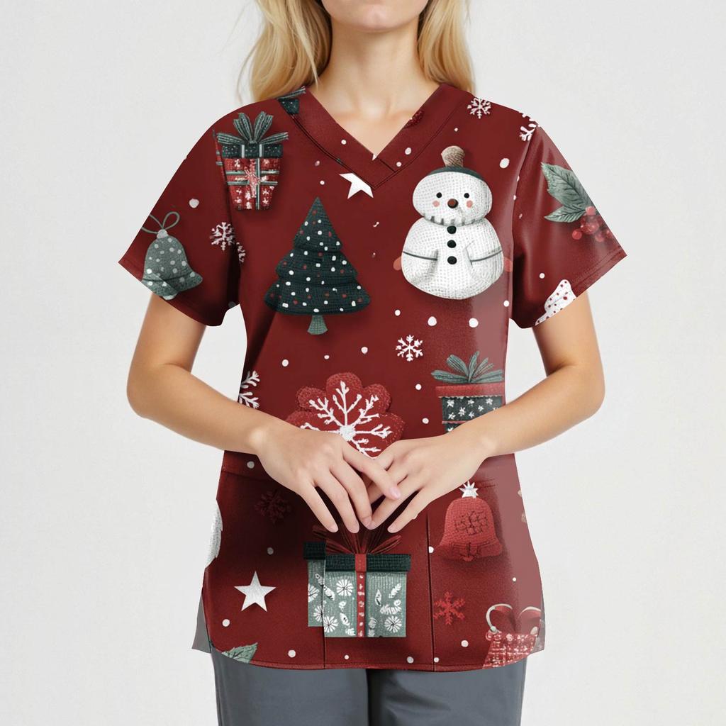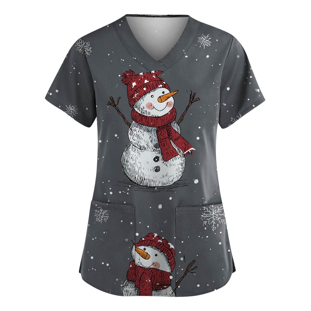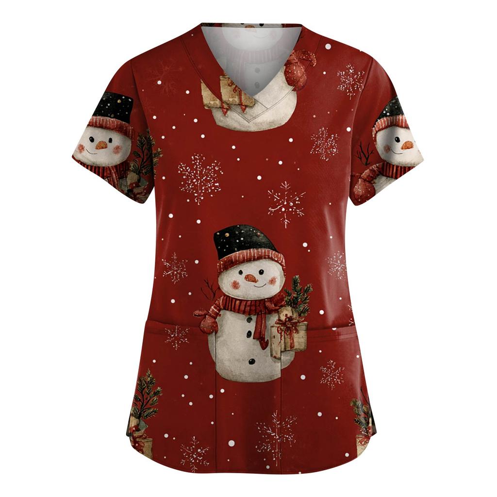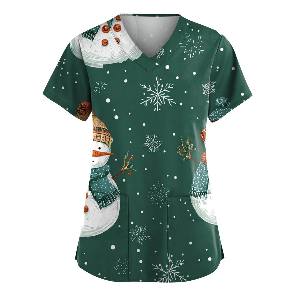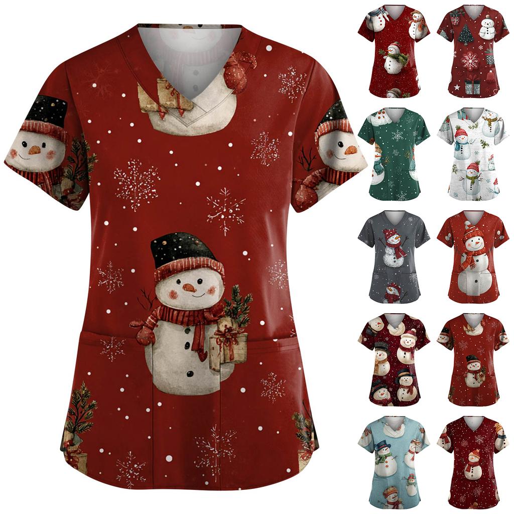 Женская модная рабочая одежда с V-образным вырезом и короткими рукавами, с карманами, топ с рождественским принтом, униформа для сиделки