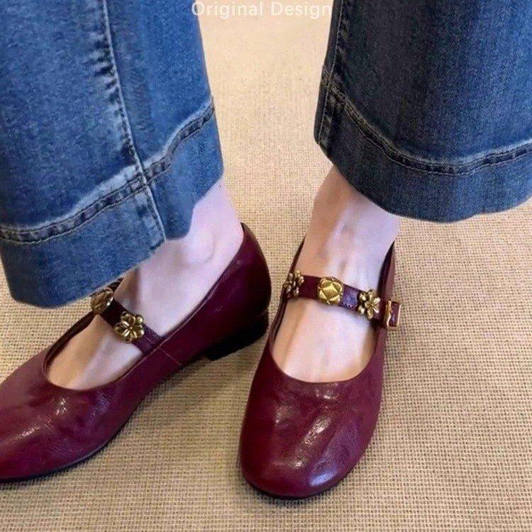 Действительно мягкая кожа~ универсальные туфли-лодочки на плоской подошве для женщин 2025 новые красные с юбкой Мэри Джейн маленькие кожаные туфли для женщин