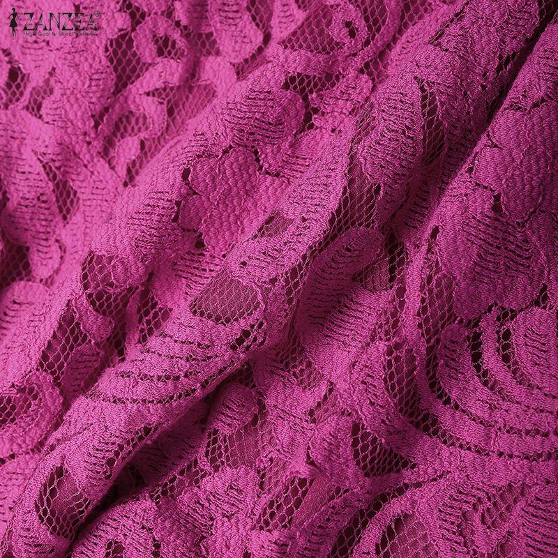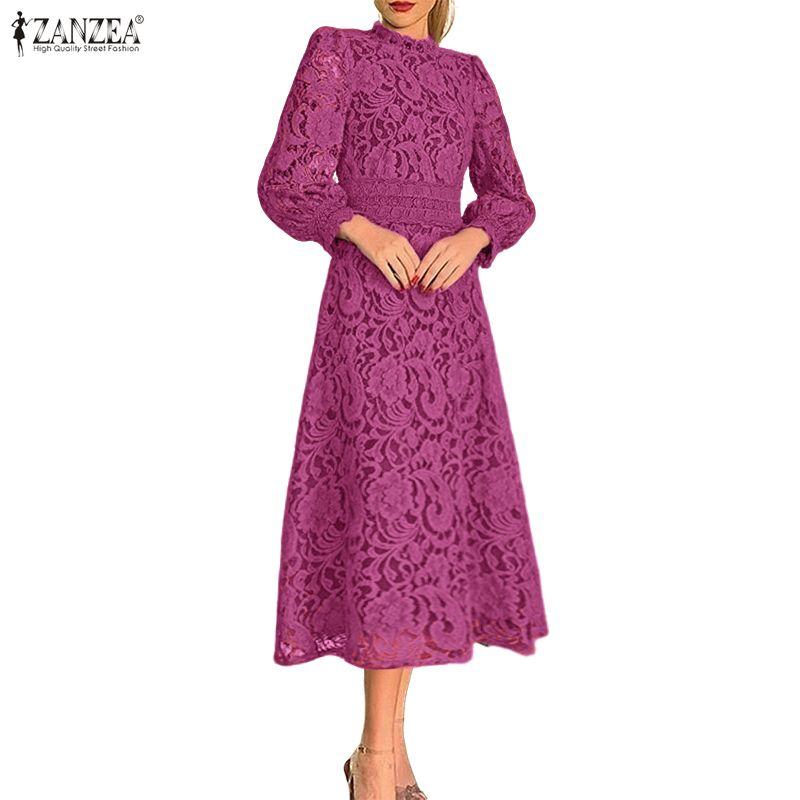 ZANZEA Женское повседневное платье с длинным рукавом, кружевной вязкой крючком, пэчворк, длинное, со стойкой