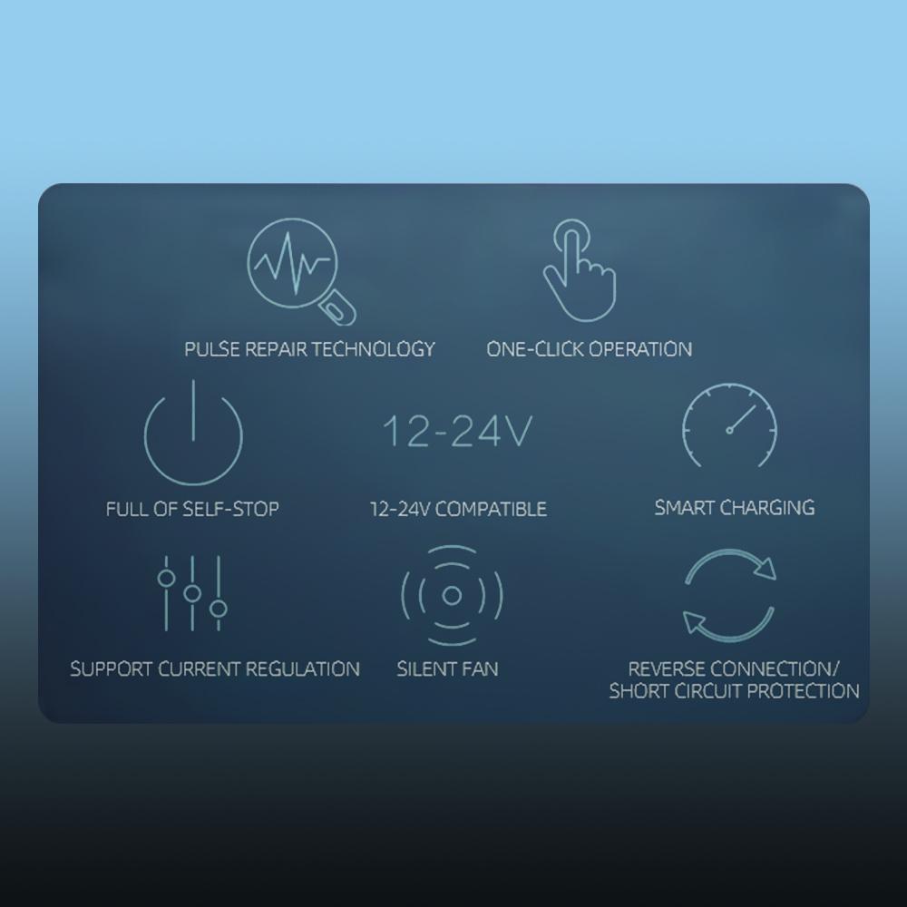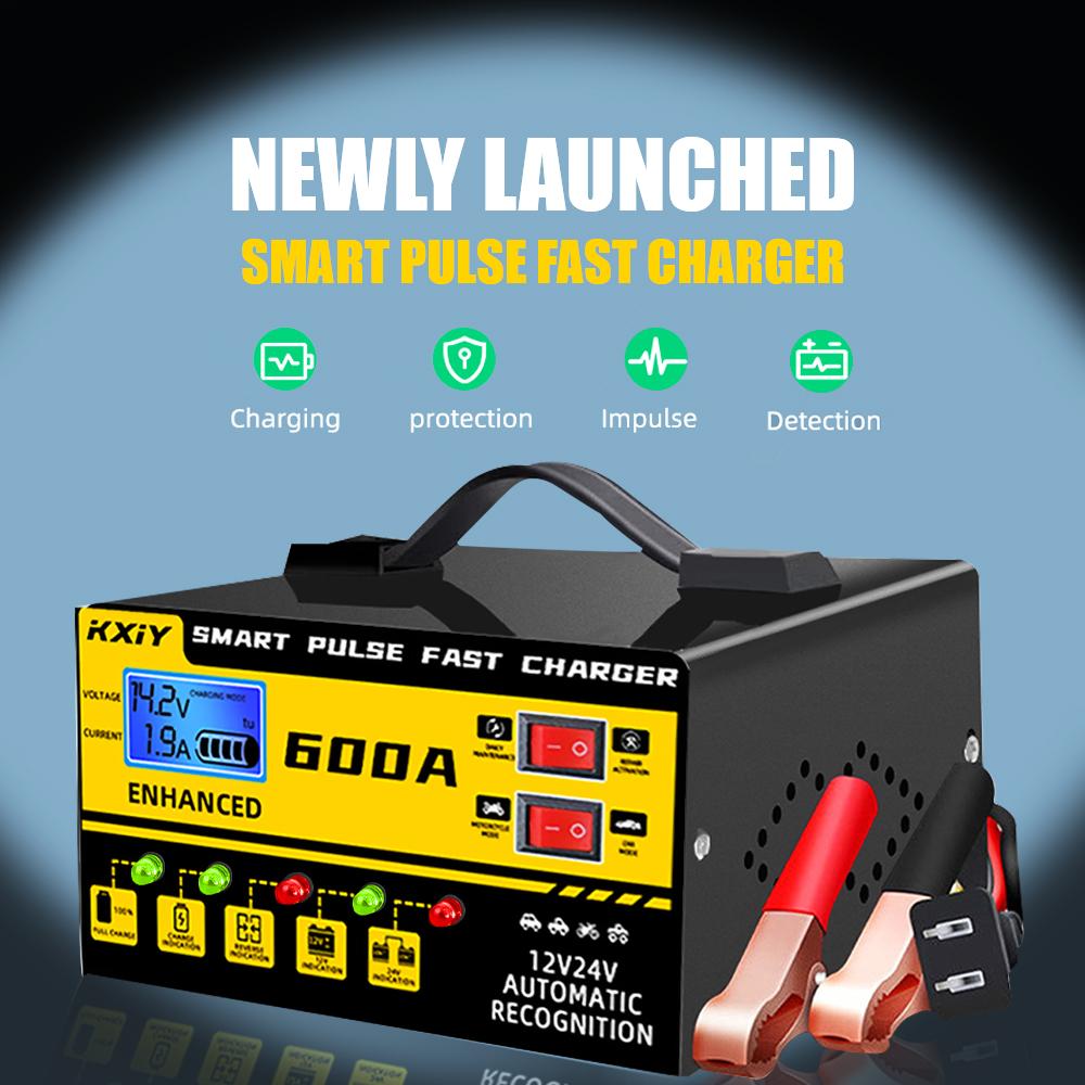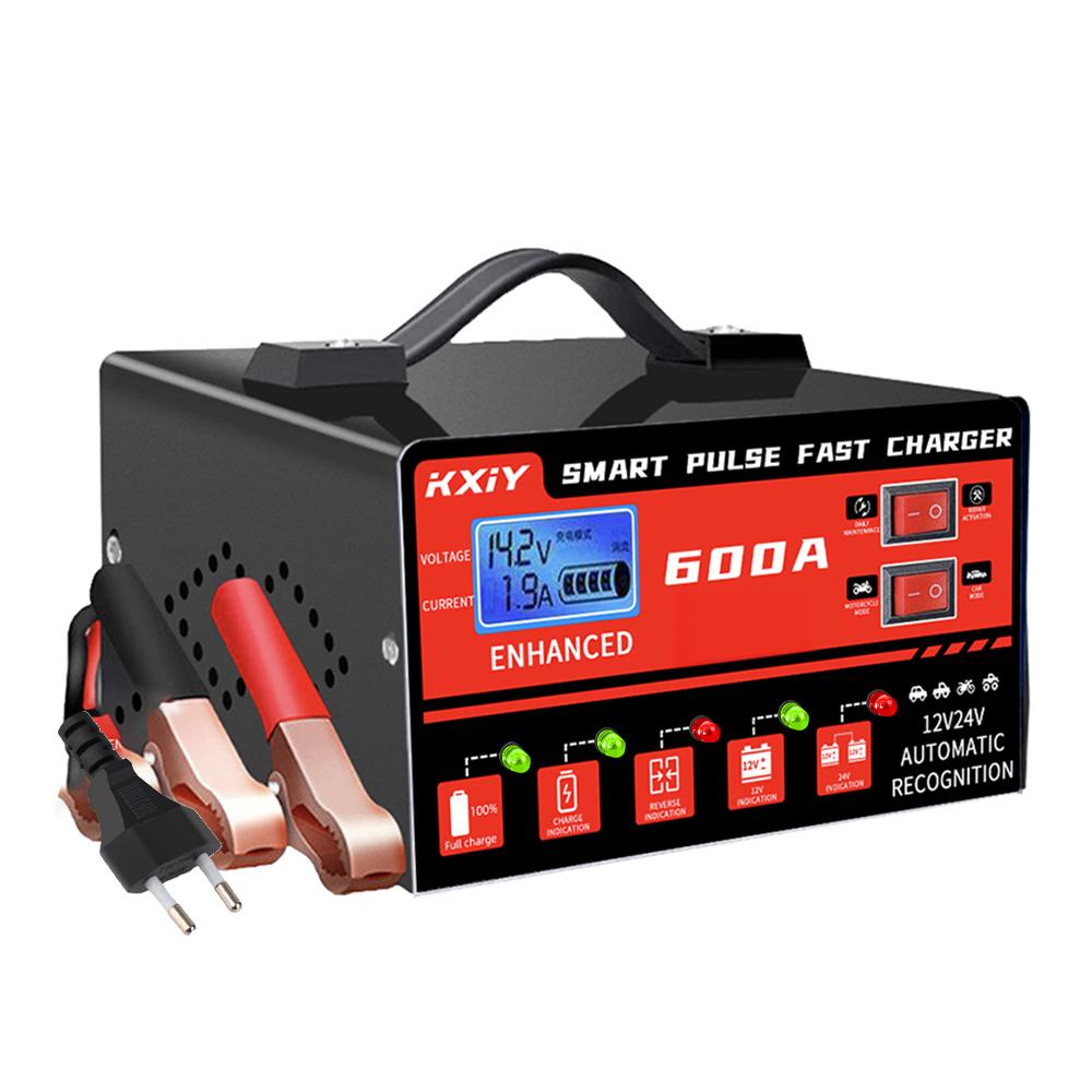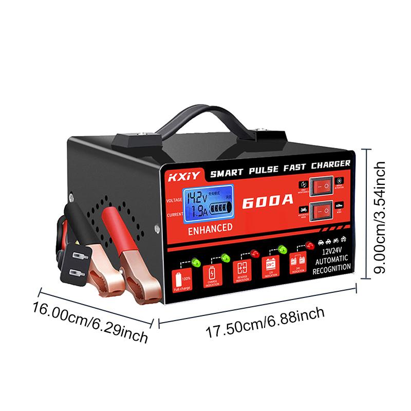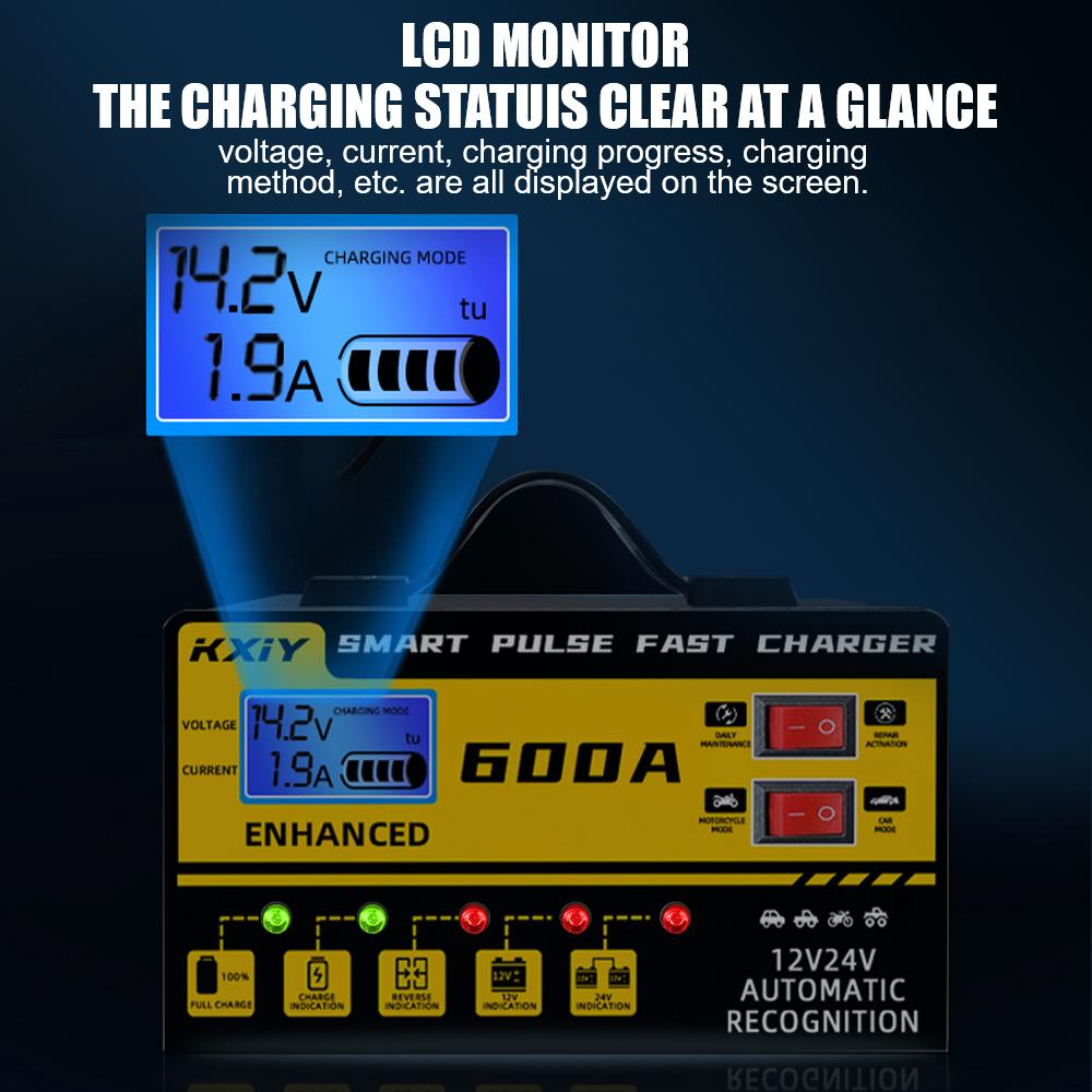 Интеллектуальное импульсное восстановление Защита от перенапряжения Автоматическая остановка напряжения Обнаружение температуры Цифровой ЖК-дисплей Зарядное устройство для автомобильного аккумулятора 12 В 24 В 600 А