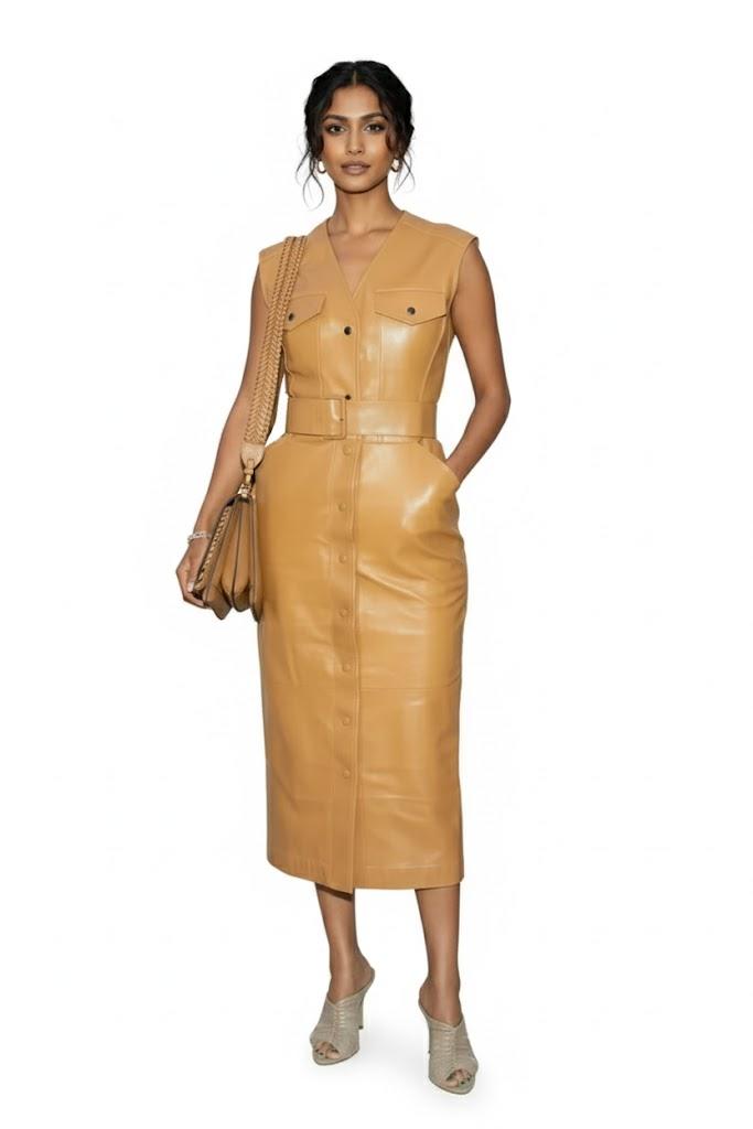 Натуральная овчина Приталенный Крой Трендовое Новое Женское Платье из Мягкой Кожи Песочного Цвета с Дополнительным Поясом