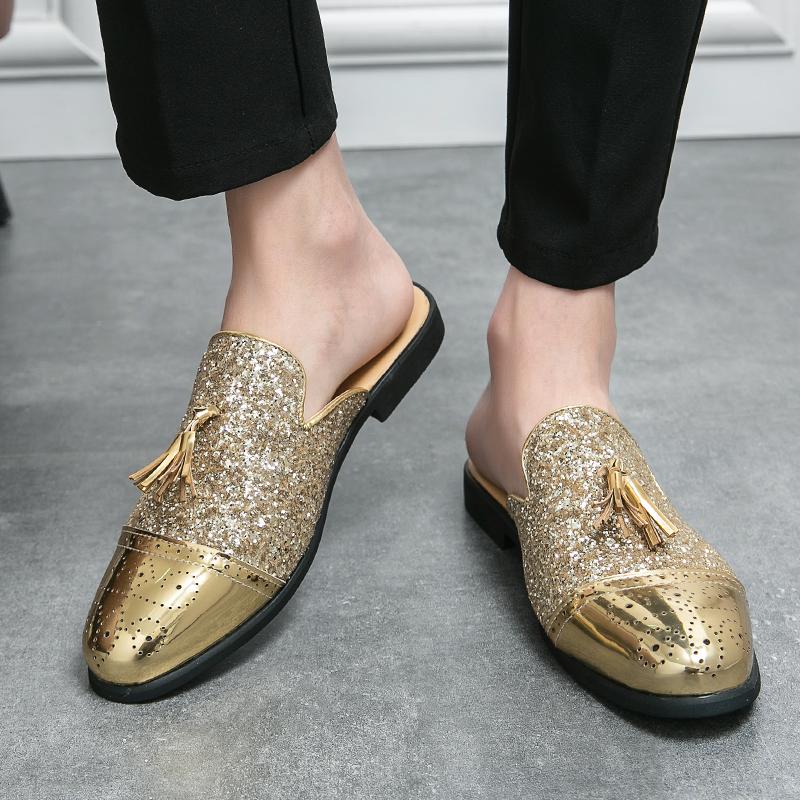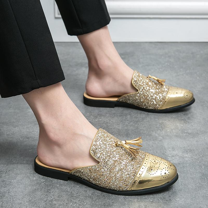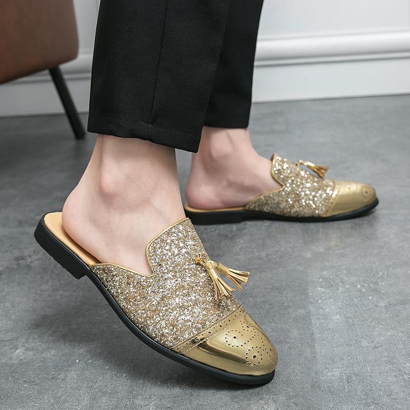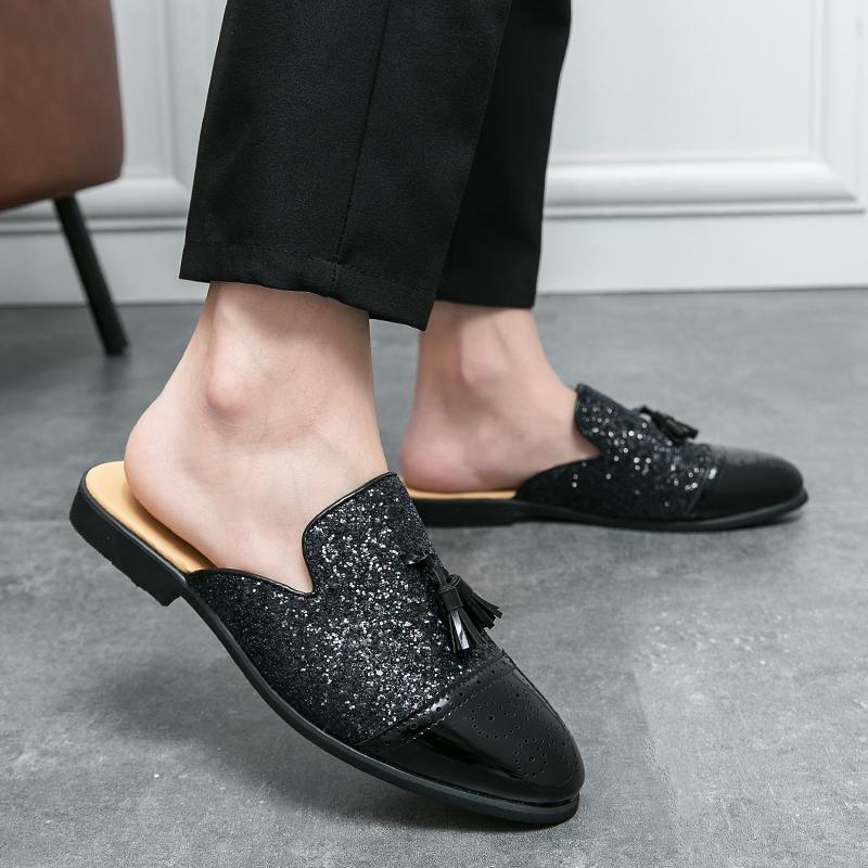 Роскошные полушлепанцы с блестками для мужчин, большой размер 38-47, кожаные лоферы, мужские мюли с кисточками, повседневная обувь, мужская летняя обувь Zapatos De Hombre