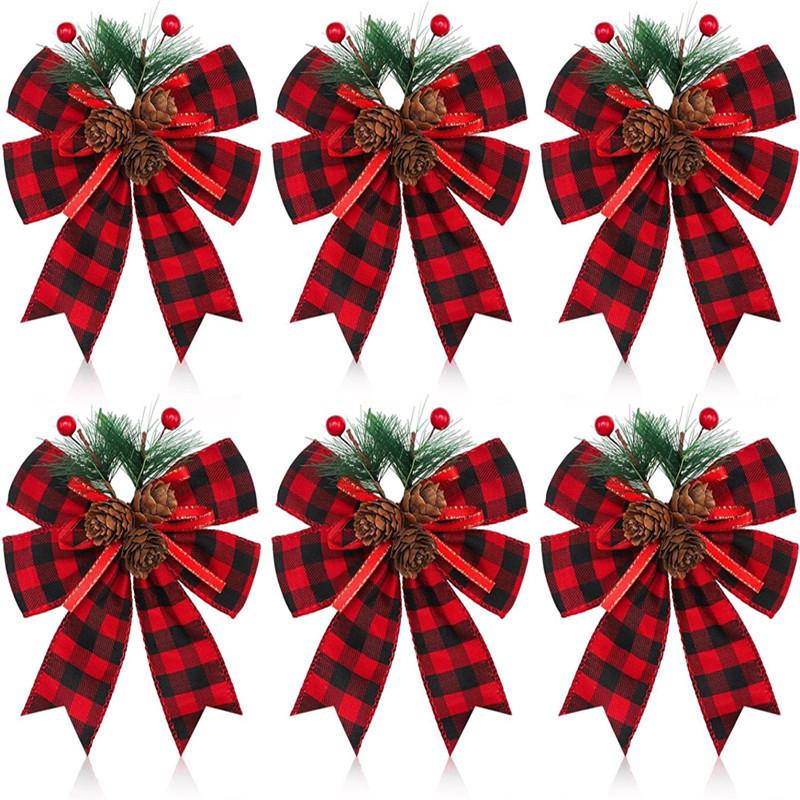 6PCS Christmas Pinecone Pine Needle Bow Christmas Grid Ribbon Bow Christmas Tree Decoration Bow Home Furnishings