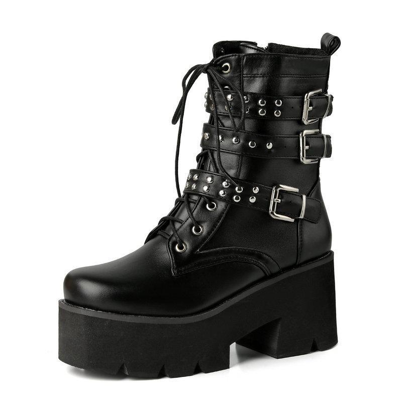 Martin boots women's autumn and winter new black square head leather boots thick heel high heel versatile thick sole belt buckle locomotive short
