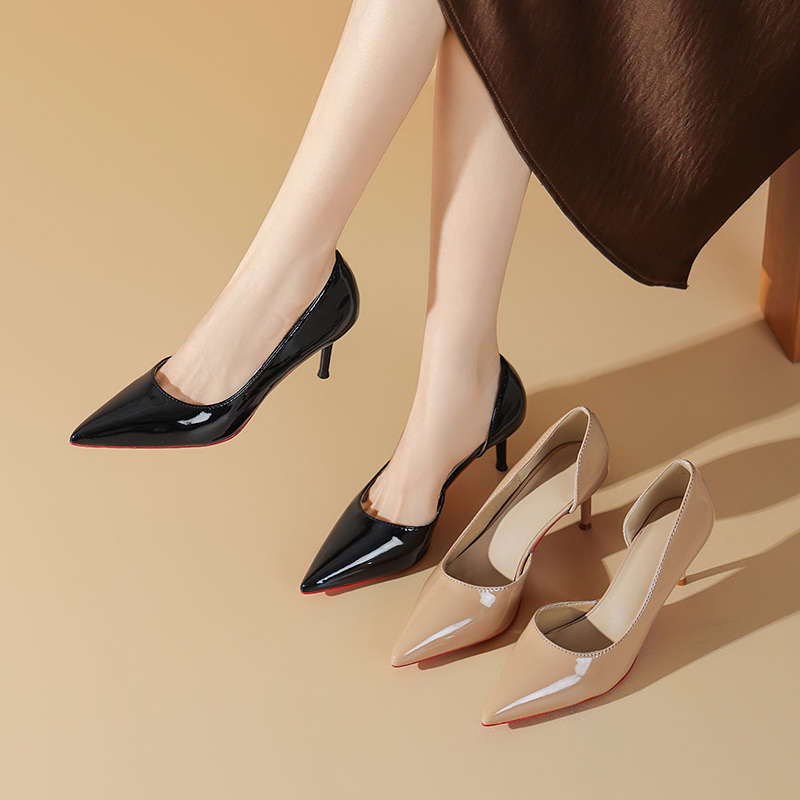 Стильные черные туфли на высоком каблуке, тонкий каблук, открытая сбоку острая носочная часть, платье с неглубоким вырезом, простые и универсальные из лакированной кожи, весна и лето с красной подошвой