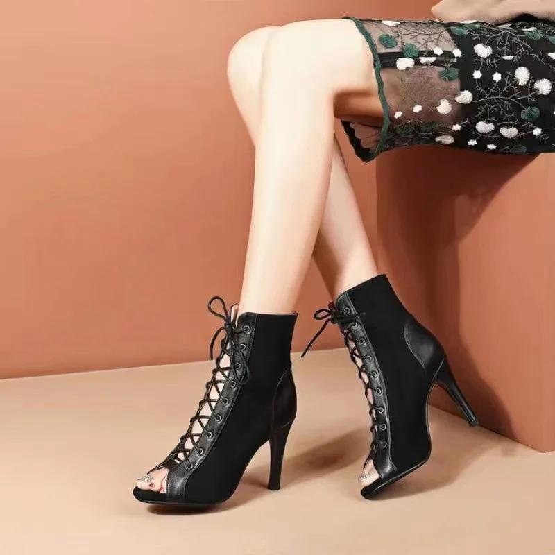 Сандалии с полыми сетчатыми каблуками, женская обувь, лето 2024, тренд, черные, на шнуровке, сексуальные, с открытым носком, туфли на шпильке, женская обувь для джазовых танцев