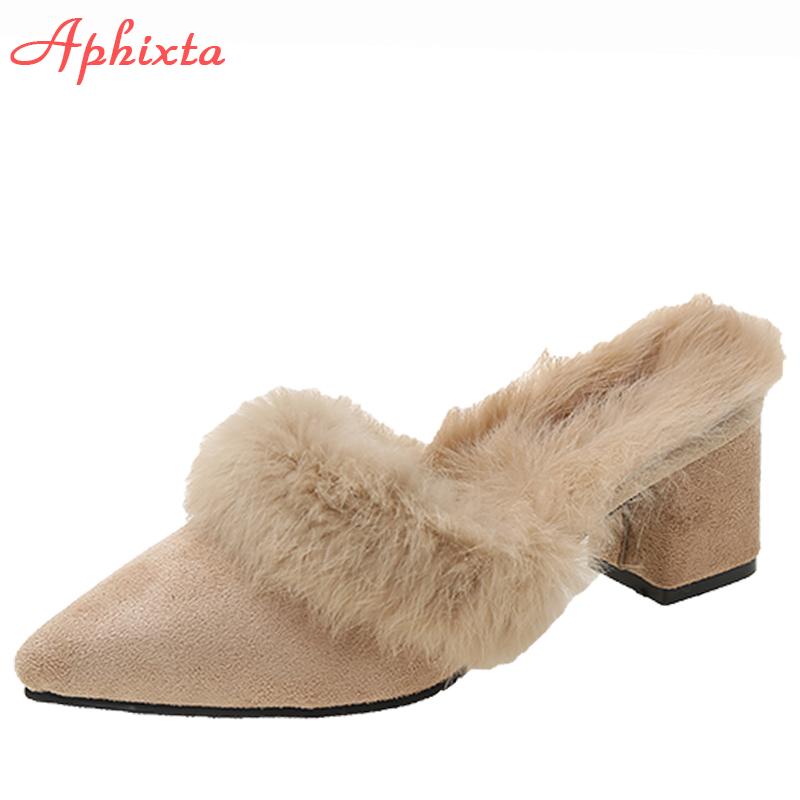 Aphixta Теплые тапочки из натурального кроличьего меха Женская обувь Зима Острый носок Роскошный натуральный мех Квадратный каблук Леди Mujer Домашние шлепанцы