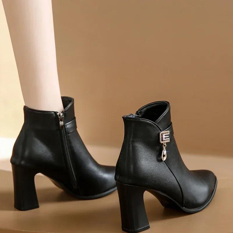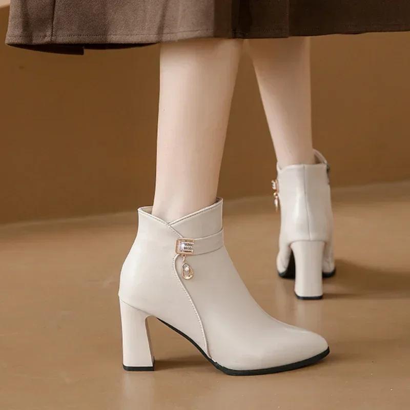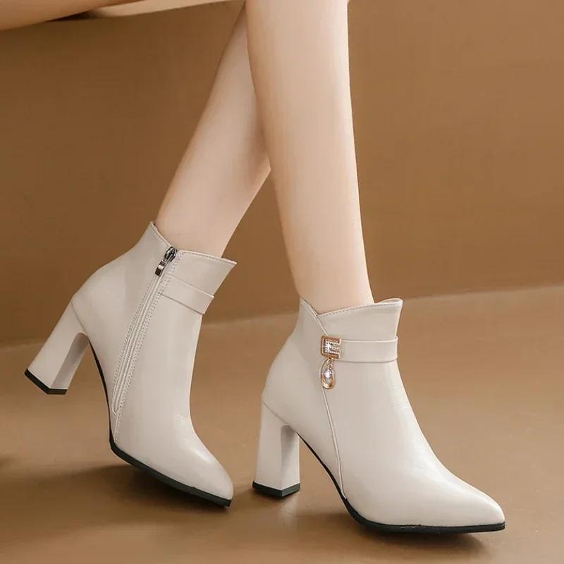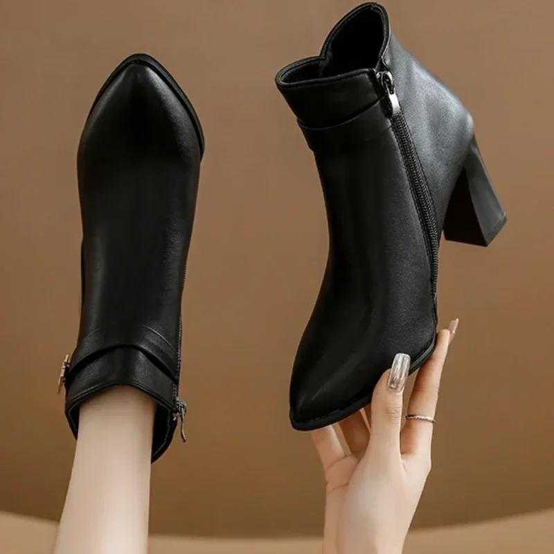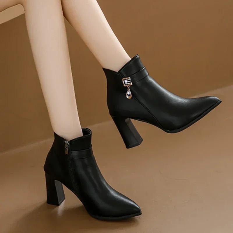 Зимние Новые Повседневные Туфли Острый Носок Толстый Каблук Однотонные Боковая Молния Элегантные и Удобные Женские Ботинки