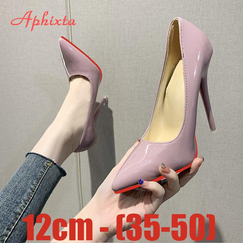 Aphixta 12 см Супер Высокие Тонкие Каблуки Туфли Женская Обувь Острый Носок Патентная Кожа Свадебное Платье Офис Женская Супер Большой Размер 49 50