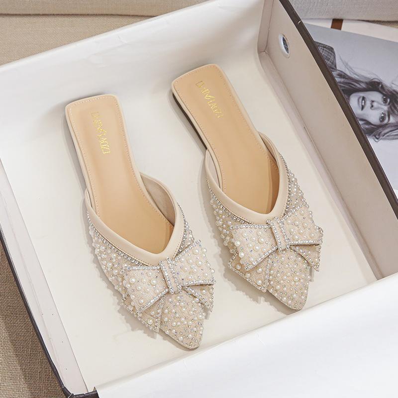 Роскошная женская летняя верхняя одежда 2024 года, новые повседневные тапочки с плоской подошвой Water Diamond Lazy Man Baotou, классные тапочки большого размера 43