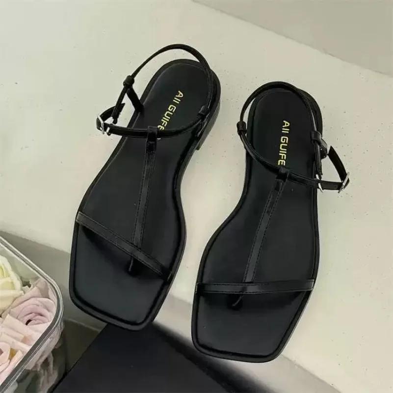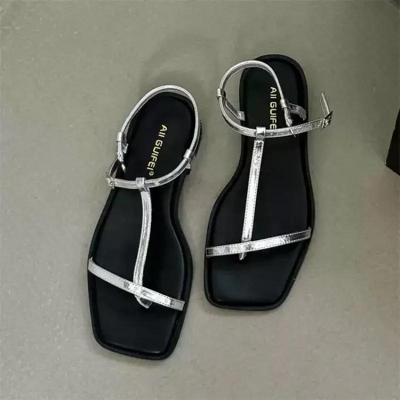 Женская обувь 2024 Новые сандалии на ремешке вокруг щиколотки Летние сандалии с перемычкой для пальца и пряжкой Однотонные повседневные пляжные сандалии на плоской подошве Zapatos De Mujer