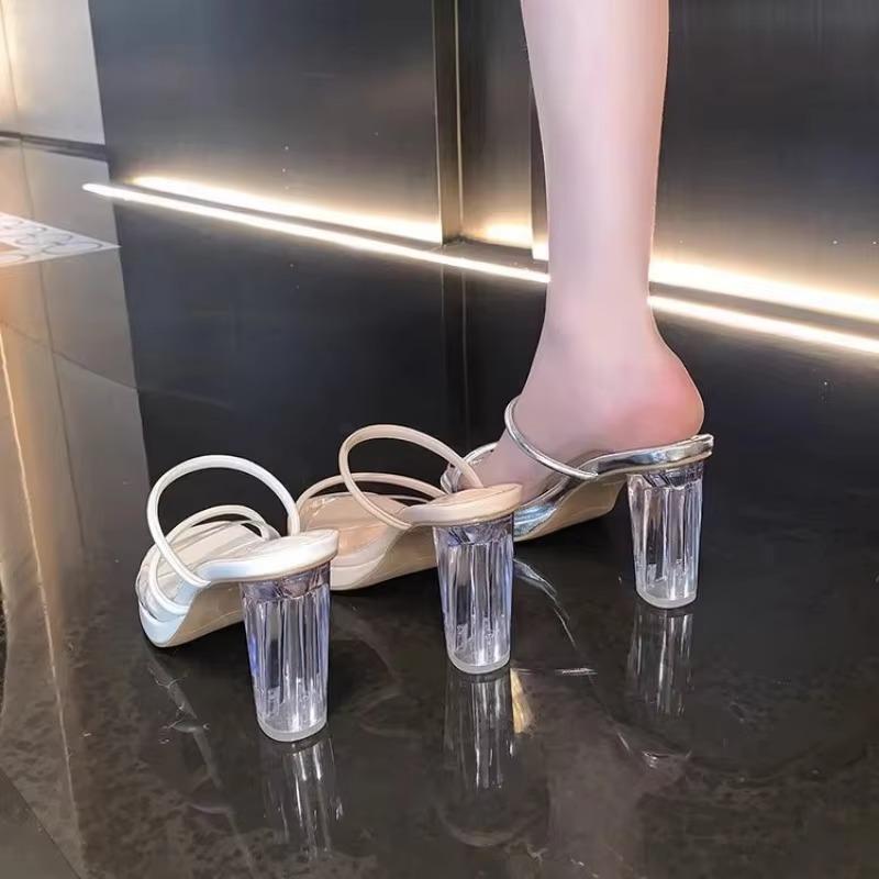 Модные Женские Туфли на Высоком Каблуке Верхняя Одежда Туфли 2025 Лето Новые Прозрачные Свадебные Сандалии На Одной Лямке С Толстым Каблуком Хрустальный Каблук Крутые Шлепанцы