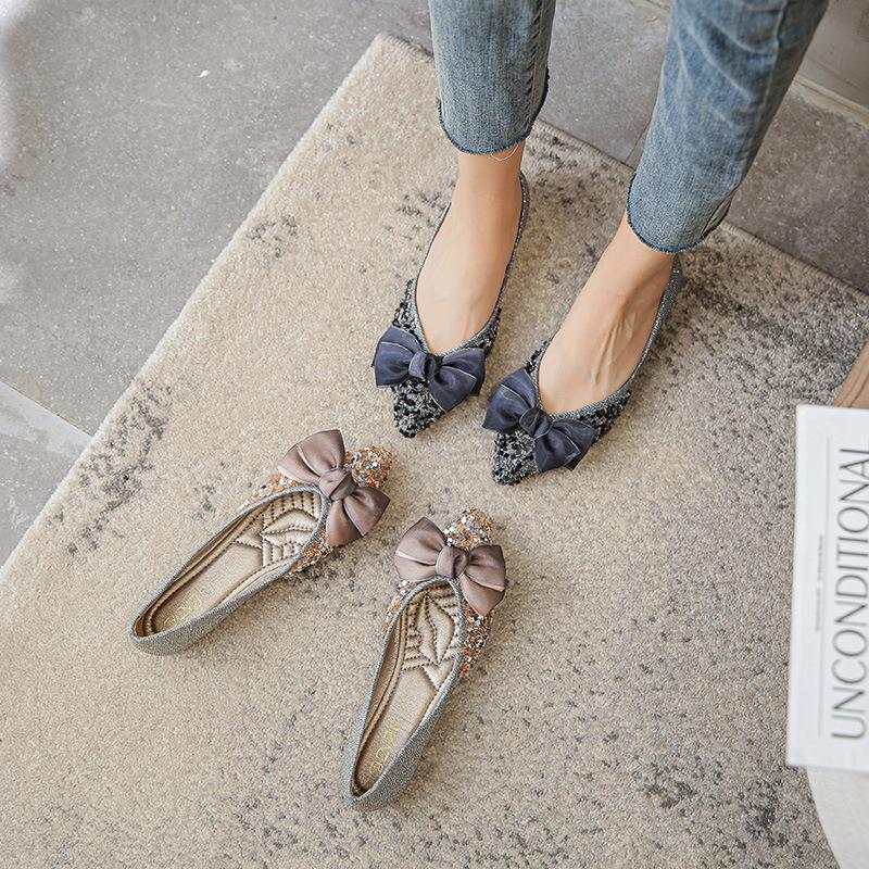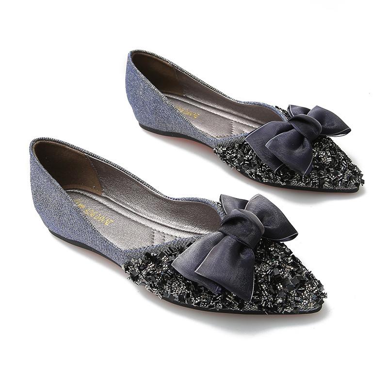 Мода 2025 Весна Новые Туфли-лодочки с бантом Женские на плоской подошве со стразами Остроносые Туфли-бини Лоферы Большой размер Женская обувь 34-43