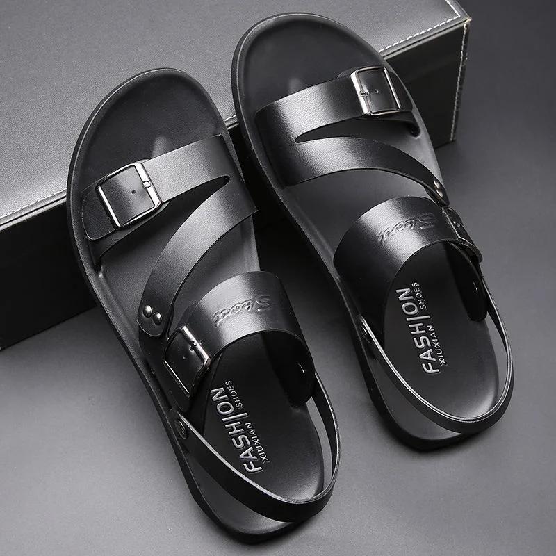 Мода Модные Сандалии Мужские Однотонные из ПУ Кожи Мужская Обувь Летние Удобные с Открытым Носком Кожаные Мужские Сандалии Пляжная Кожаная Обувь