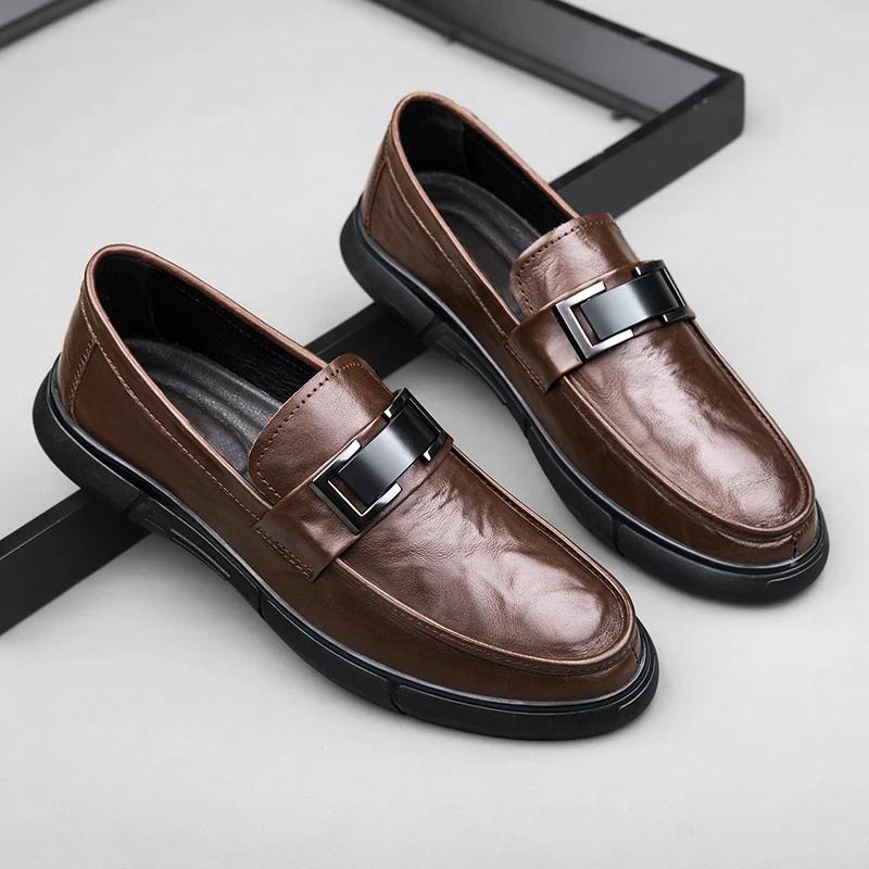 Модные новые мужские мокасины с металлической пряжкой, коричневые деловые кожаные туфли, повседневные прогулочные мокасины на мягкой подошве, брендовые удобные туфли для вождения