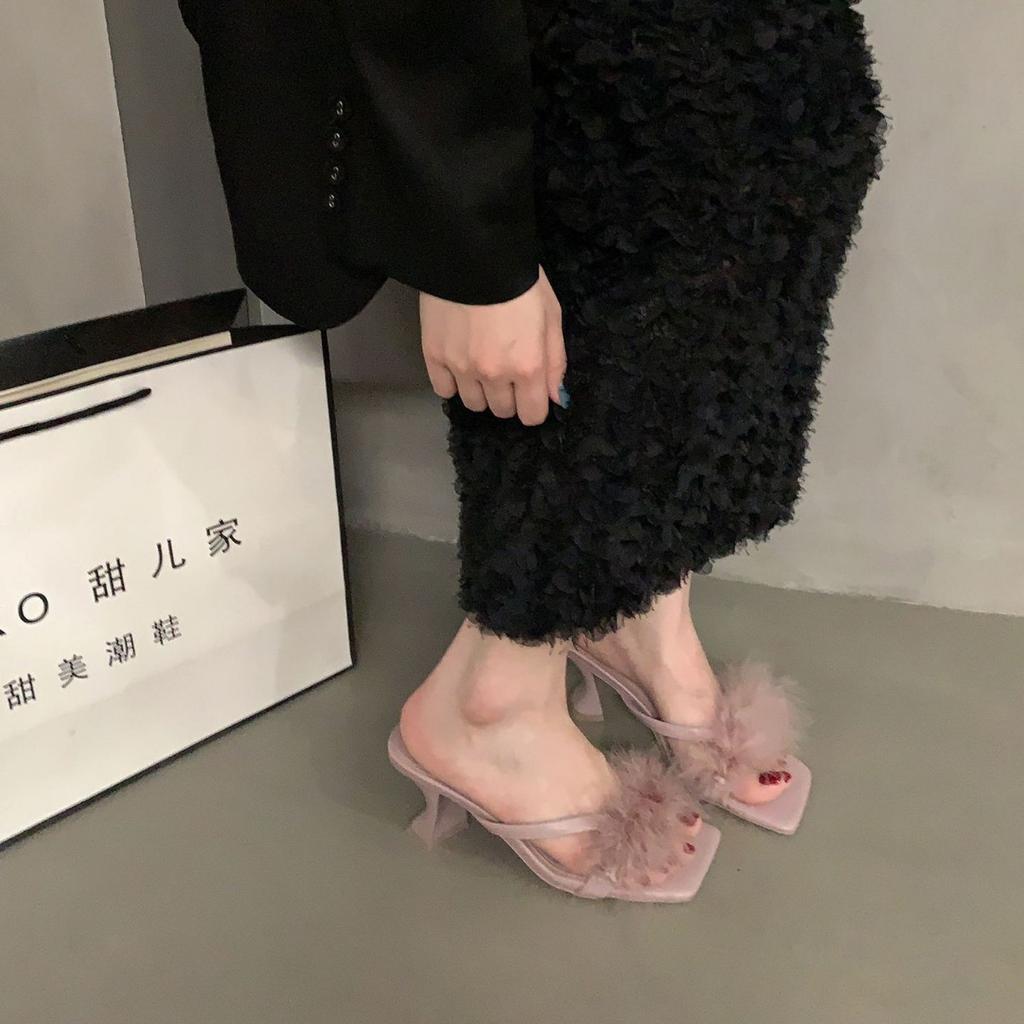 Французские пушистые тапочки на высоком каблуке, женская обувь, новинка 2025 года, летние черные сандалии в стиле феи