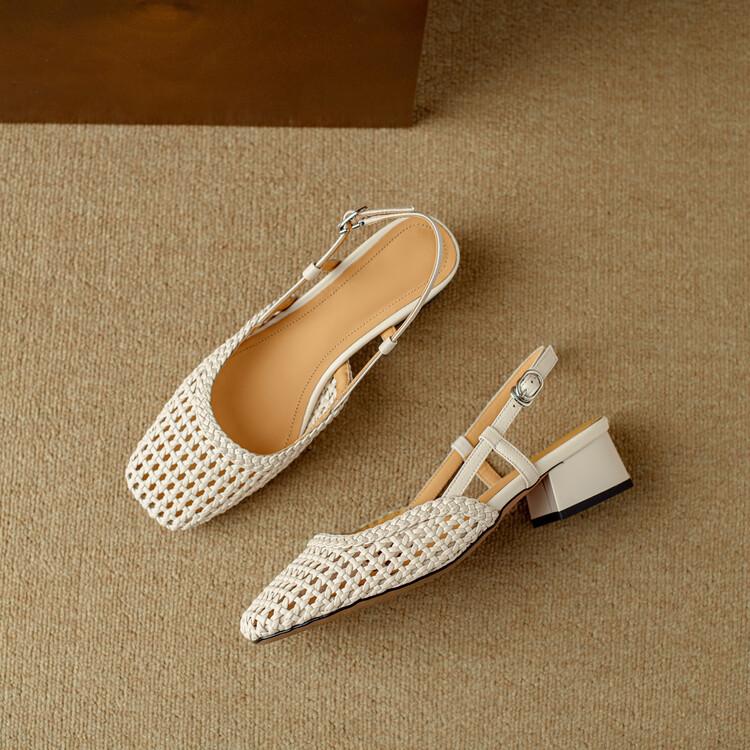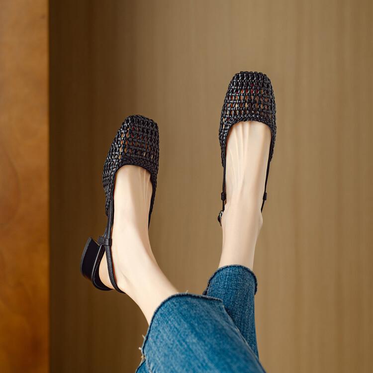 Французские ретро плетеные полые сумки головные сандалии женские лето 2025 новые нежные ремешок сзади толстый каблук одинарная обувь