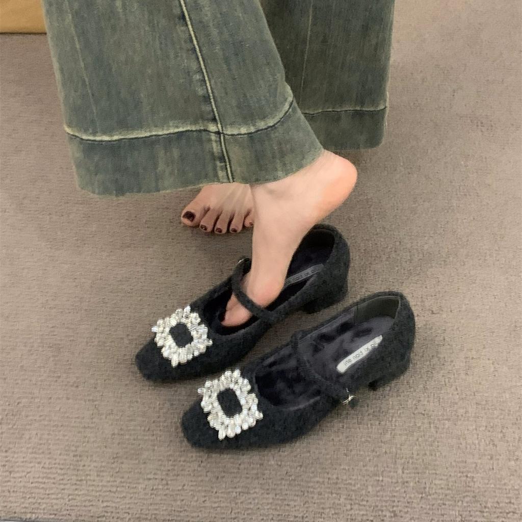French velvet gray Mary Jane fluffy shoes women's shoes 2025 autumn and winter temperament high heel square head rhinestone shoes