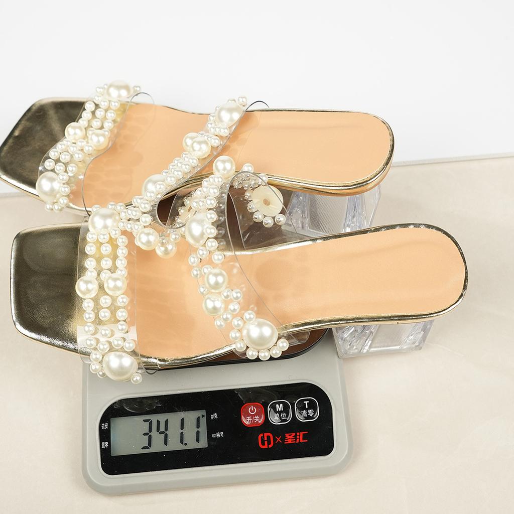 Прозрачные хрустальные туфли на высоком каблуке летние новые сандалии с жемчугом толстый каблук квадратный носок носить одним словом большой размер тапочки женские