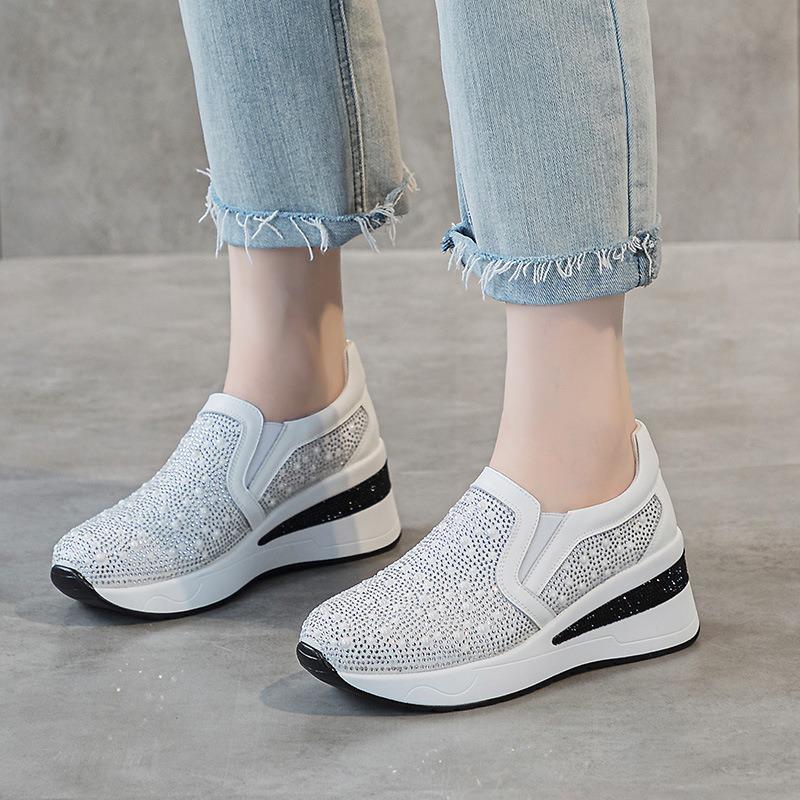Модные 7 см Воздушная сетка Микрофибра Кожа Платформа Клин Женские Блестящие Осенние Скрытые Каблуки Массивные Кроссовки Весенние Модные Ботинки Обувь