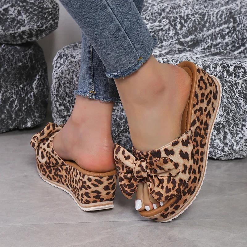 Модная обувь для женщин Летняя мода Современные шлепанцы Уличные простые Шлепанцы для принцессы Пляжные шлепанцы Женские с бантом на танкетке Леопардовые женские туфли