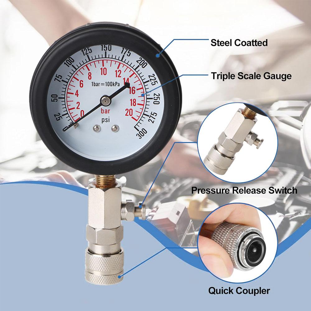 Dual Gauge Readings: 0-300psi, 0-20bar (1bar=100kPa)