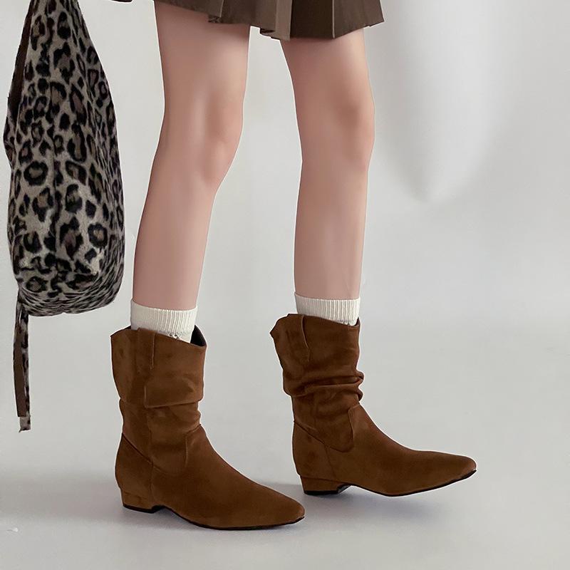 Модные ретро универсальные плиссированные ботинки-чулки женские 2025 осень и зима новые матовая кожа острый носок низкий каблук ковбойские сапоги