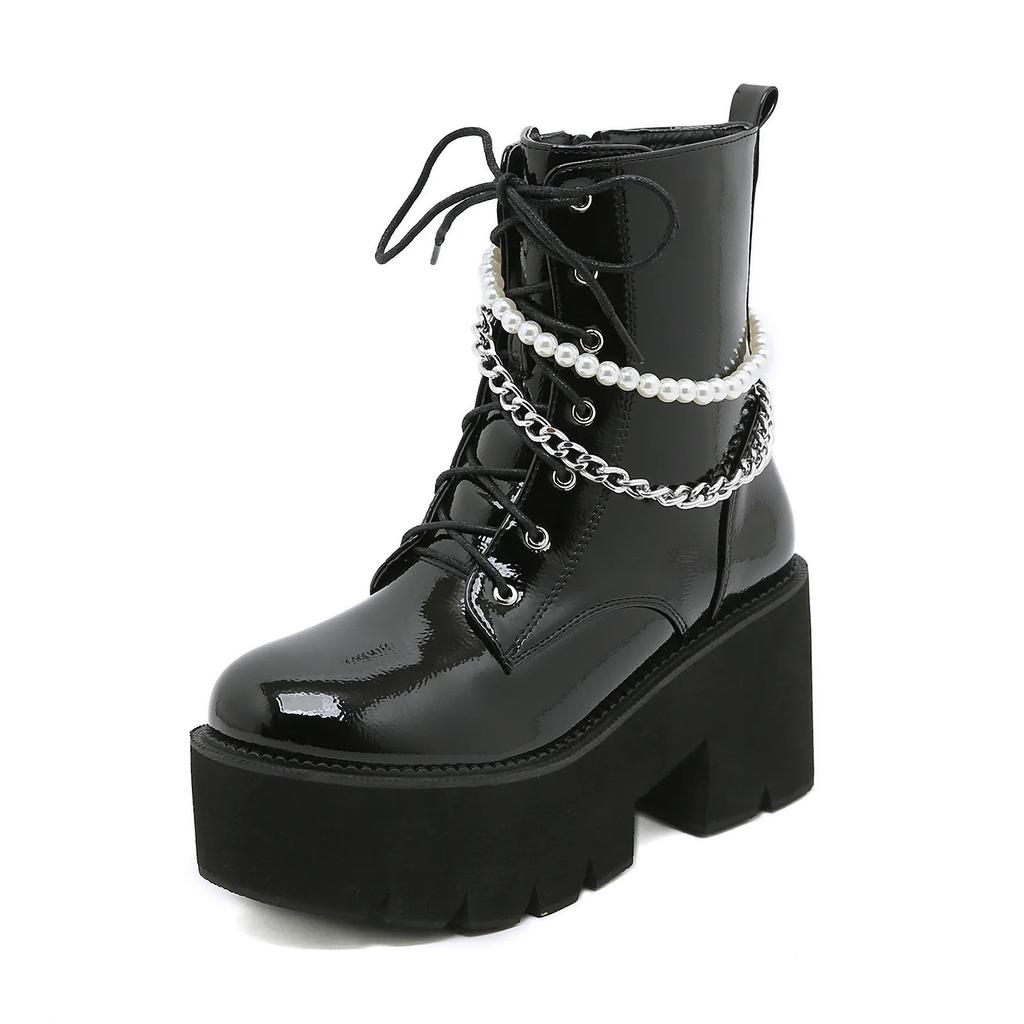 Женские ботильоны в панк-стиле, туфли на платформе, на шнуровке, зимние готические ботильоны челси из лакированной кожи с круглым мысом, цепочкой и молнией, сексуальные